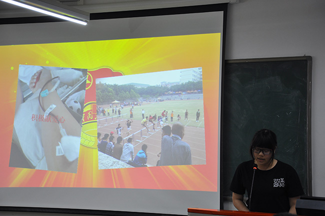 在同学代表热烈的掌声中,评比活动正式开始。大一各个团支部的团支书通过PPT展示了各支部丰富的校园生活,并详细地介绍了各支部的学习情况、文体娱乐活动、优秀学生代表、及其支部和个人的获奖情况。通过他们的精彩演讲表现出了我们计算机系学子强大的凝聚力和自信心,尽展我们计算机系学子的风采。