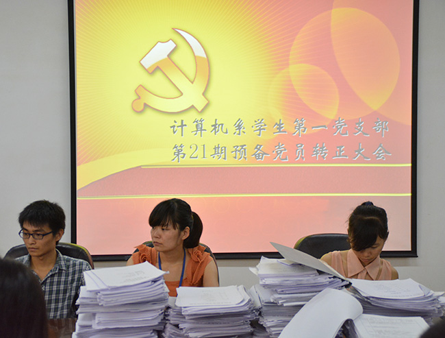会上,预备党员黎大渝、曾秀秀、李家辉、袁茂祯、毛捷、朱思远6名同学汇报预备期内表现情况,支委会报告对预备党员教育考察情况,提出转正意见,与会党员充分讨论,指出预备党员优缺点,与会正式党员对预备党员转正投票表决,一致通过6名同学转正申请。
