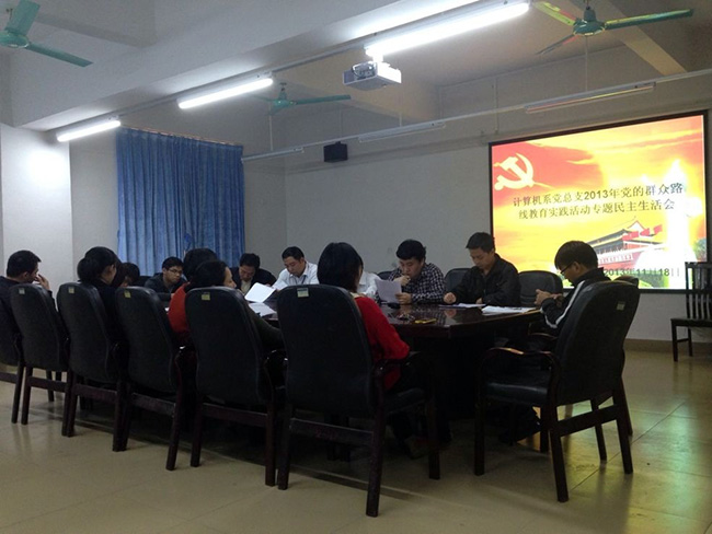 2013年 11月18日下午,按照学院党委和系党总支的统一部署与要求,计算机系党总支在11栋305会议室召开了关于党的群众路线教育实践活动专题的民主生活会。会议邀请了广东技术师范学院天河学院党委委员、党群工作部副部长陈朝阳到会进行指导,与会人员有:计算机系主任申青莲、计算机系党总支书记彭康煜及总支委员、教工党支部成员、学生党支部委员。会议由计算机系办公室主任袁桢强主持。