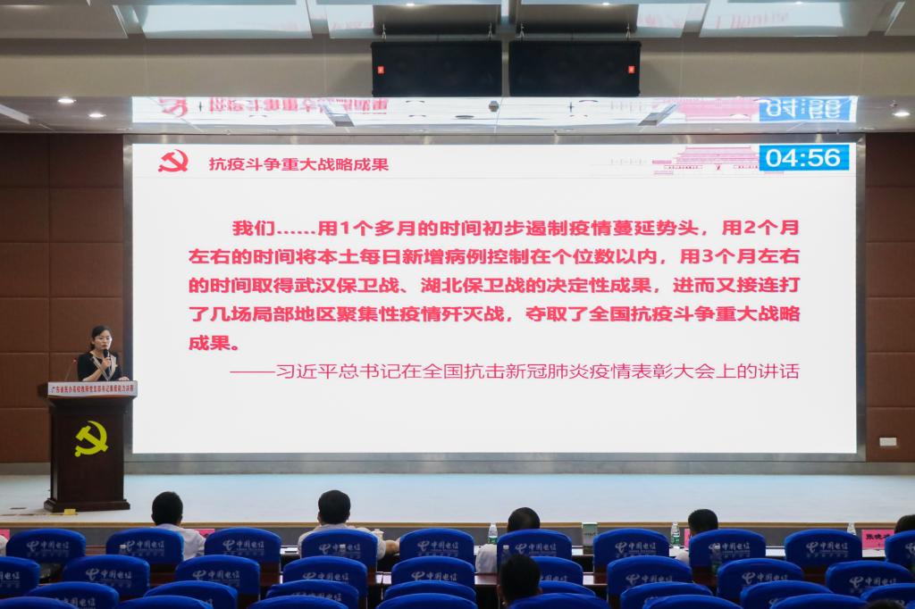 决赛共分为三个环节,分别是党务知识测试、微党课讲授和党支部书记创新工作案例展示。其中,在微党课讲授中,陈星莹老师以《抗疫有我、自信前行》为主题,从广州理工学院师生主动参与抗击新冠肺炎疫情的故事入手,结合我国抗击疫情的现状,分6个方面阐述了中国特色社会主义制度优越性,帮助大家坚定四个自信。在创新工作案例展示环节,陈老师以《打造融合思政教育的专业课堂》为主题,分别从案例背景、具体实施、取得成效和创新点四个方面,展示了计算机学院教工党支部深入探索课程思政改革之路。