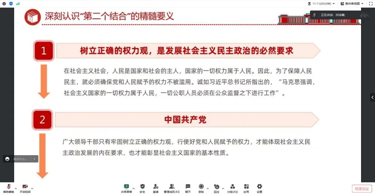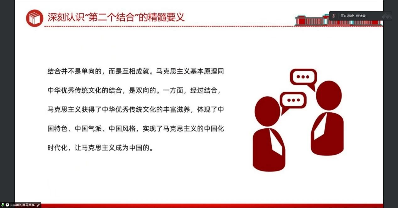 会上,学生第三党支部青年委员洪诗蕾同志带领党员同志从“两个结合”的精髓要义、筑牢中国特色社会主义道路根基、打开广阔的创新空间和巩固文化主体性四个方面展开学习。通过学习,同志们对习近平新时代中国特色社会主义思想与“两个结合”的运用有了初步的了解,并且结合自身的实践经历,更好地对理论学习有了深入的体会。