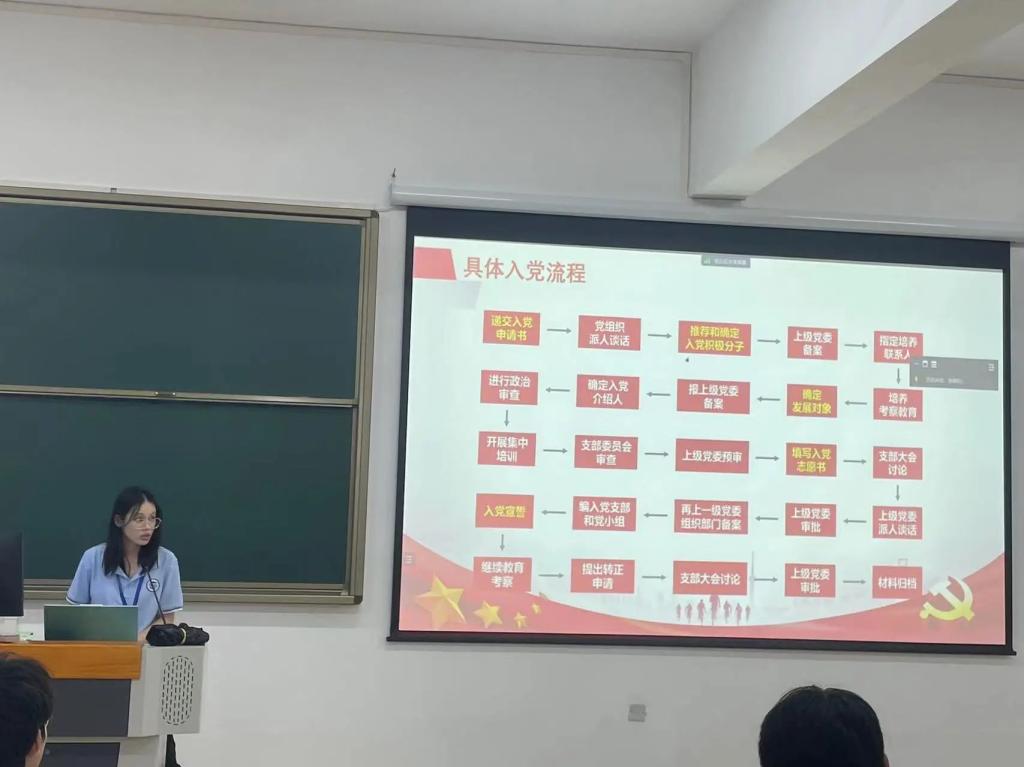 袁子钧老师为了让新生正确看待入党问题,树立正确的入党动机,详细了解入党流程,争取做合格的党员,特此讲解了《中国共产党发展党员工作细则》以及党员的发展流程,并对每一个流程进行了详细的介绍。同学们要想申请入党,首先便是要递交入党申请书。袁老师希望同学们在了解完整的党员发展流程以及入党的要求之后,能够积极递交入党申请书。