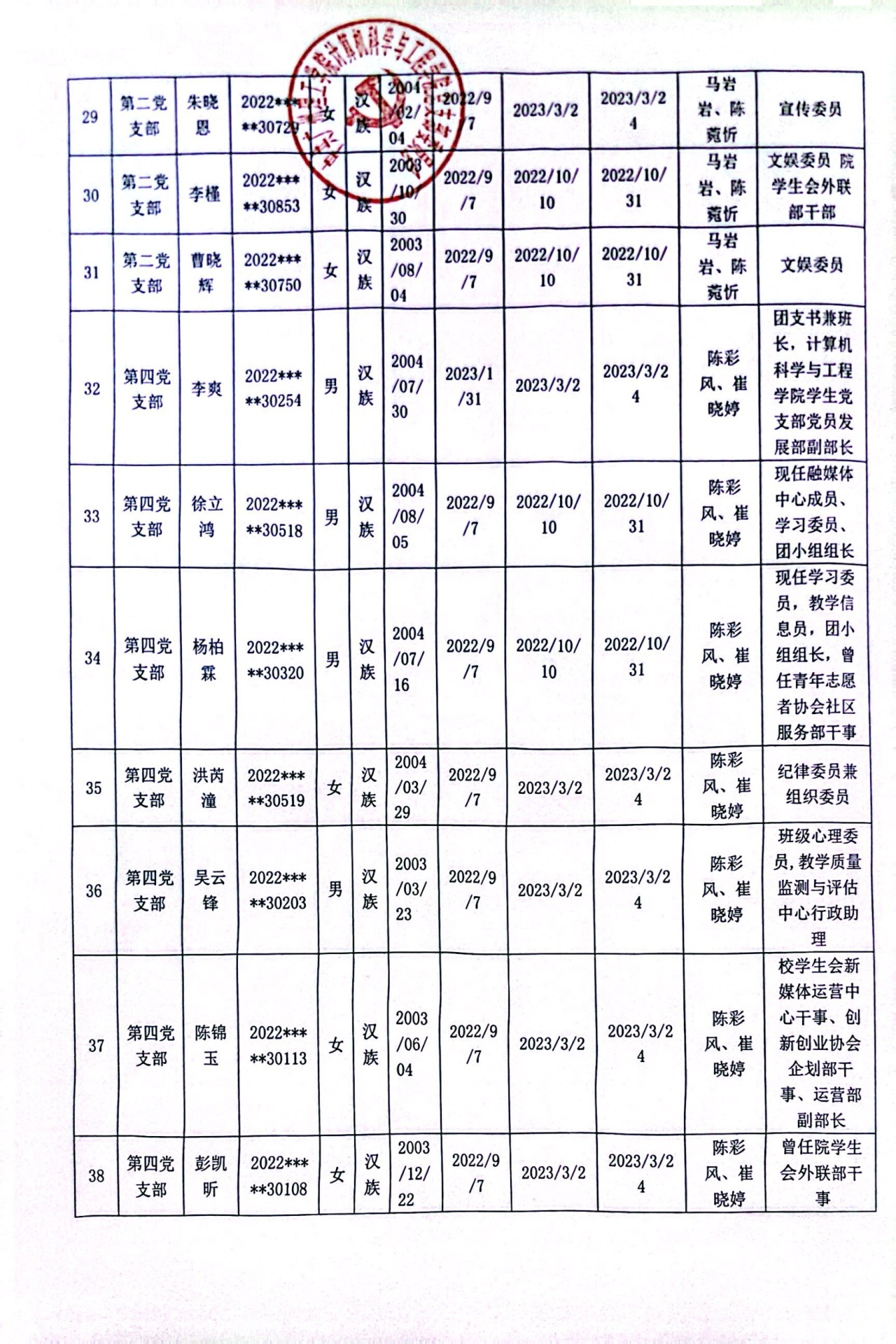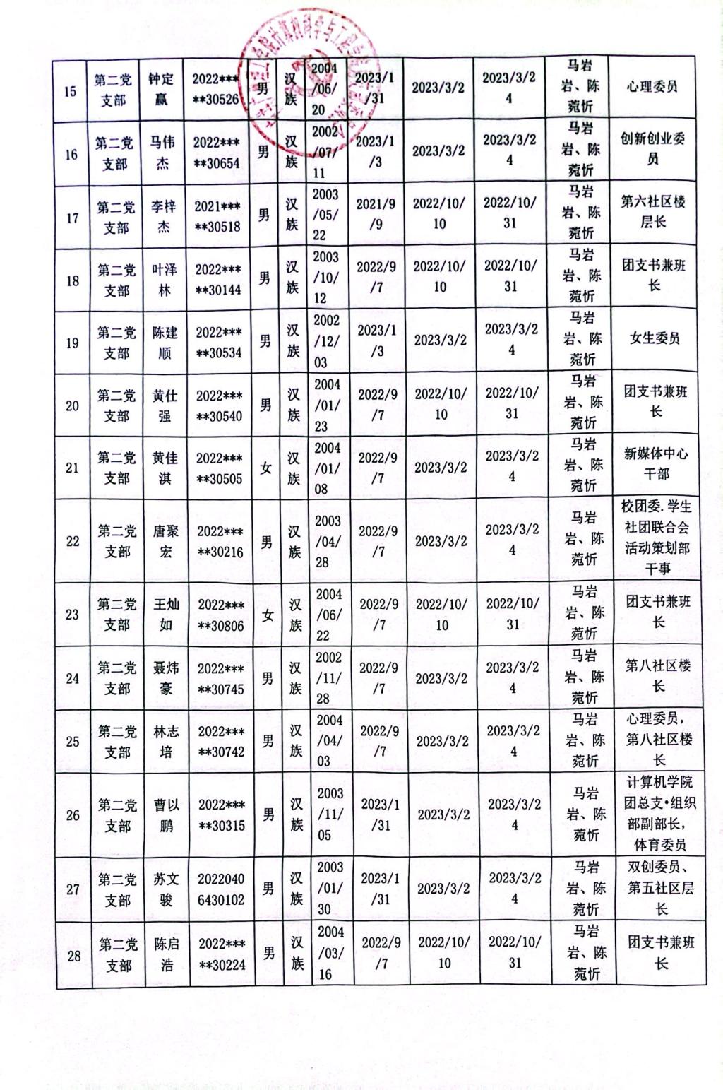 (通讯员:阳可人)在听取培养联系人、党员和群众意见的基础上,经支部大会、支委会研究决定,拟确定李美琳等50名同志为发展对象,具体情况公示如下。