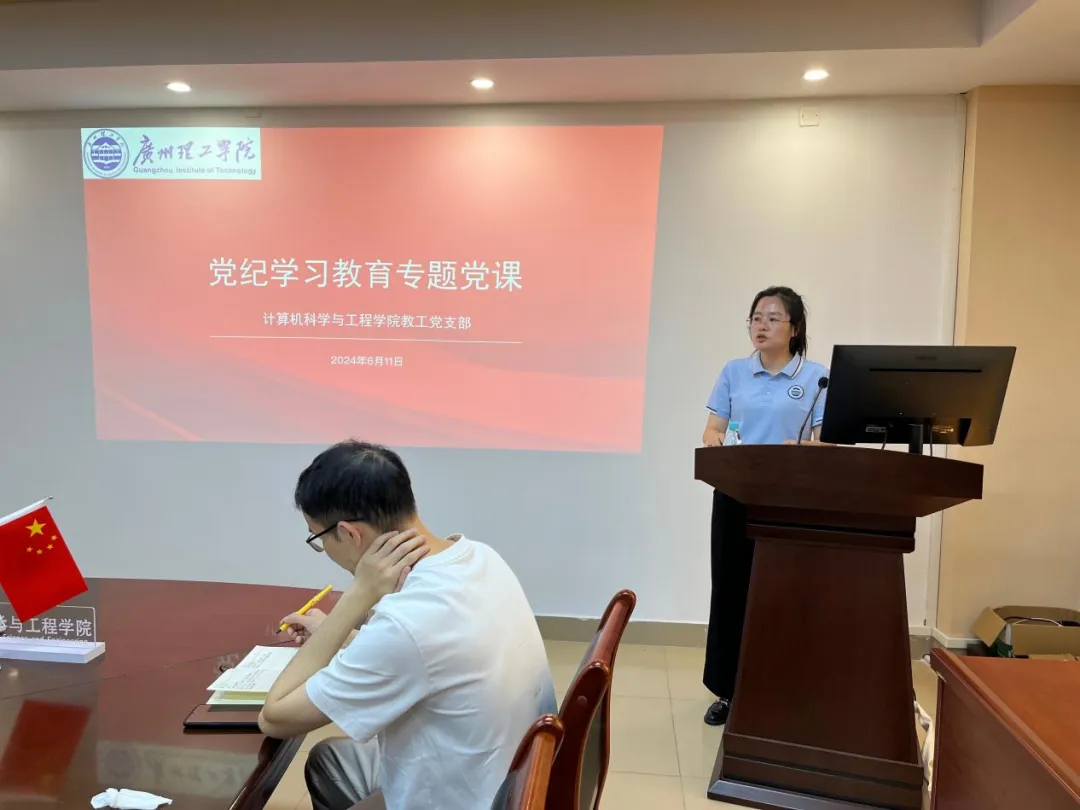 (通讯员:陈绪杨)6月11日下午,计算机学院教工党支部在会议室组织党纪学习教育专题党课,由党支部副书记陈星莹同志讲授。这是落实省委教育工委关于开展党纪学习教育的相关文件精神,旨在进一步加强学院教职工党员的党性教育,提高党员的政治觉悟和纪律意识。