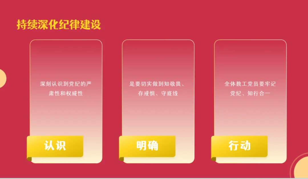 结合学校和学院工作实际,她指出,党纪是党的各级组织和全体党员必须遵守的行为规范。随后,全体教工党员围绕增强党纪学习教育展开研讨。大家纷纷表示要切实增强纪律意识,时刻绷紧纪律这根弦,做到心有所畏、言有所戒、行有所止。同时,多位教师党员同时也兼任学生党支部的组织管理工作,将严格按照学校党委要求开展相关学习实践活动,带领各自分管的学生支部把党纪与校风学风建设结合起来,为保证学校高质量发展提供坚实的纪律保障。