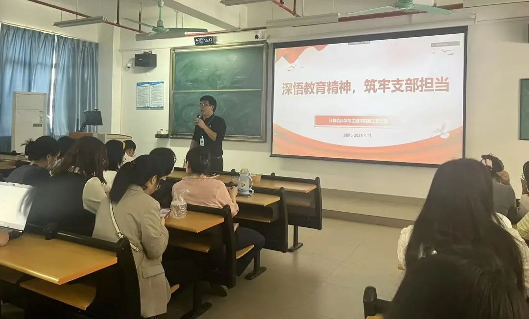 (通讯员:杨晓萍)3月13日,为深入学习并贯彻全国教育大会精神,推动教育现代化与高质量发展,促进教育事业的改革创新与交流合作,计算机科学与工程学院教工党支部在13栋教学楼402教室召开了一场专题学习会,此次会议由学院党总支书记蔡岳良亲自主持,全体教工党员积极参与,共同探讨了教育强国建设的重要意义与实践路径。