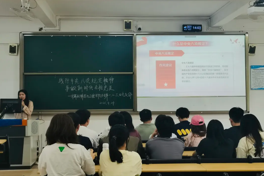 在会上,学生第四党支部书记陈彩风带领大家回顾了中央八项规定的历史背景,还详细列举了改进调查研究、精简会议活动、厉行勤俭节约等八项规定的具体内容,让党员们深刻理解了其精神实质。她还阐述了中央八项规定精神,强调这是对全体党员的纪律约束,体现了党的优良传统和作风,并提醒党员们要保持清醒认识,时刻警醒“四风”问题。
