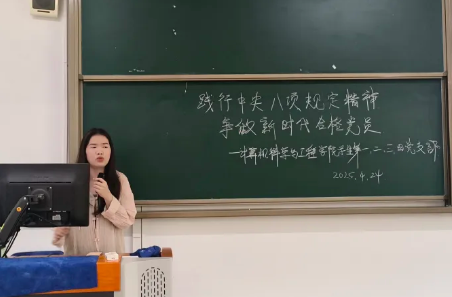 (通讯员:杨晓萍)4月24日下午,计算机科学与工程学院学生第一、二、三、四、五党支部以线上线下结合的形式于6栋314教室开展了以“践行中央八项规定精神,争做新时代合格党员”为主题的理论学习会,全体党员同志按时参会。