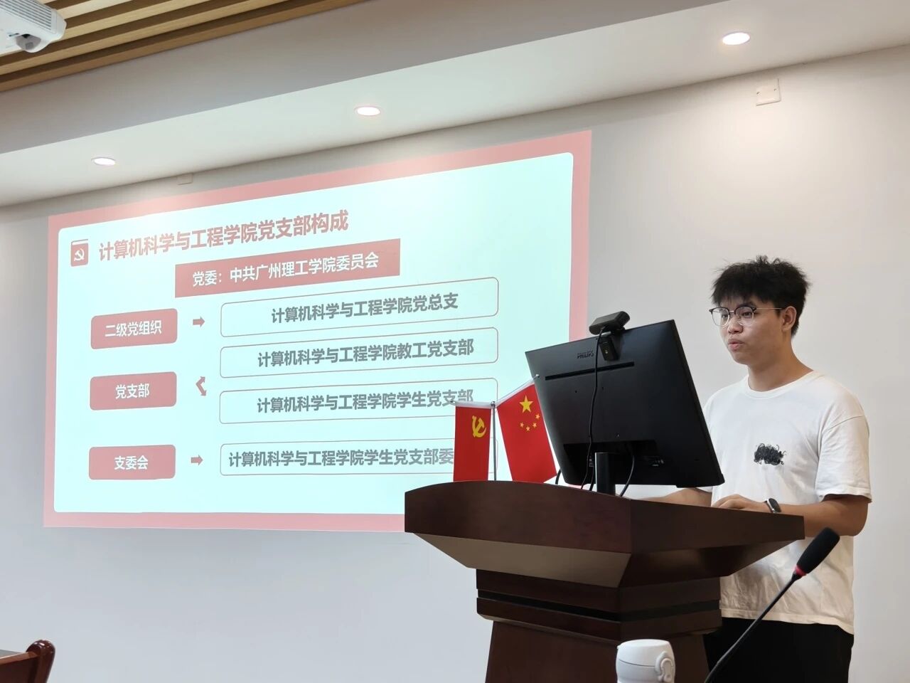 彭动同志围绕“上一学年工作总结”“党建服务中心团队介绍”“纪律要求”“业务培训”等五大板块介绍会议内容。他详细梳理了上一学年党员教育管理与活动策划成果,包括完成多名毕业生党员档案,以及开展义务维修等特色活动。随后,他介绍了党建服务中心的组织架构与各部门职责,同时强调严守保密纪律、规范会议着装等纪律要求。