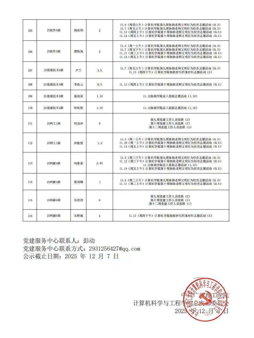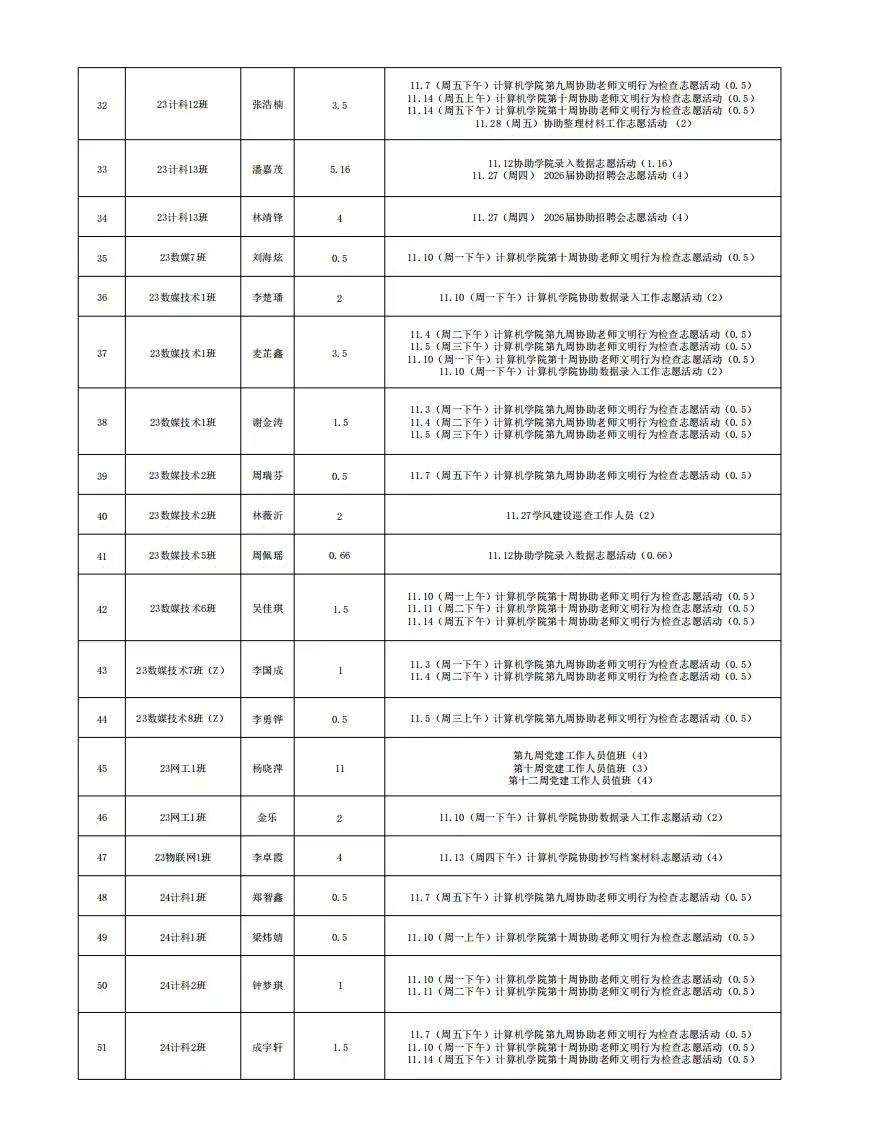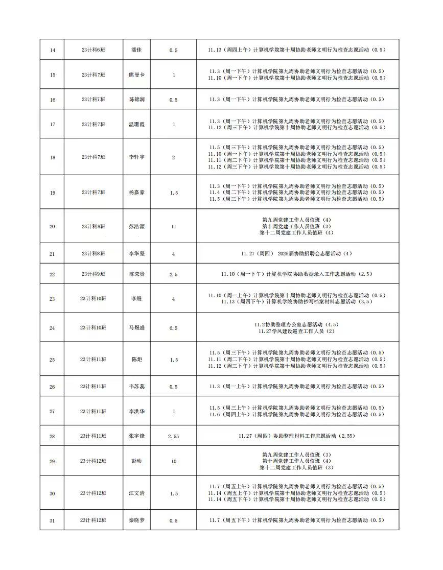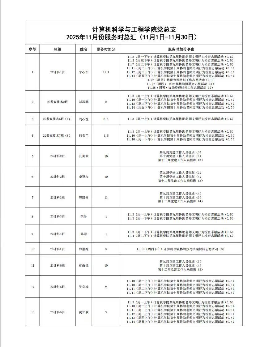 计算机科学与工程学院党总支2025年11月份服务时总汇公示