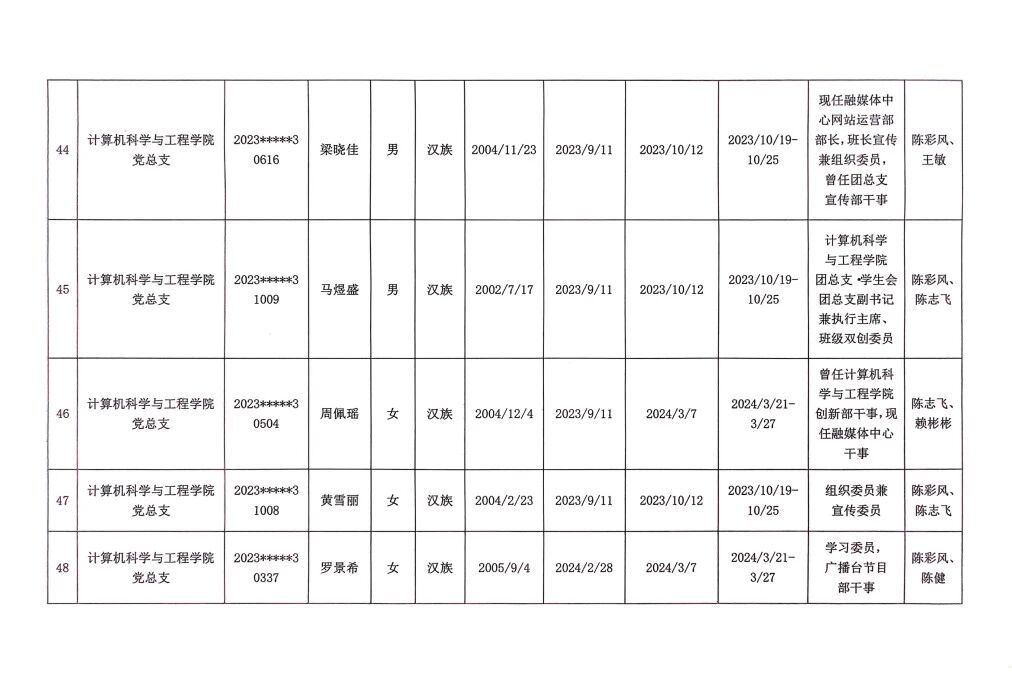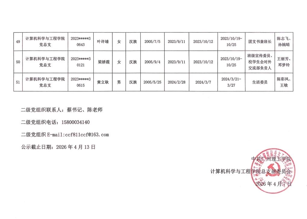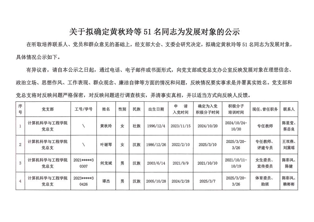 在听取培养联系人、党员和群众意见的基础上,经支部大会、支委会研究决定,拟确定黄秋玲等51名同志为发展对象,具体情况公示如下。