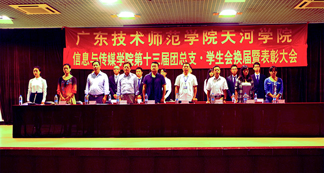 最后,主持人宣布第十三届信息与传媒学院团总支•学生会换届大会圆满结束!到场领导、嘉宾及全体成员上台合影留念。