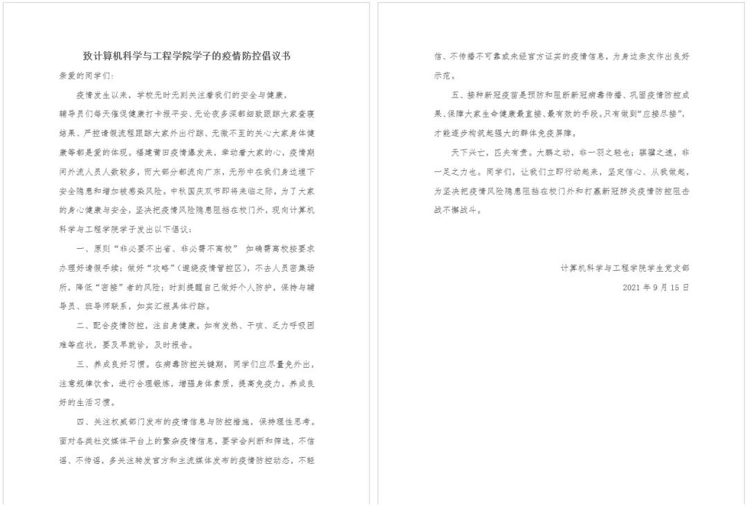 9月15日中午,计算机科学与工程学院学生党支部在11栋302开展疫情防控倡议动员会。本次会议由学生党支部书记凌诗慧主持,学生党支部成员及18、19、20、21级各班班长参加。