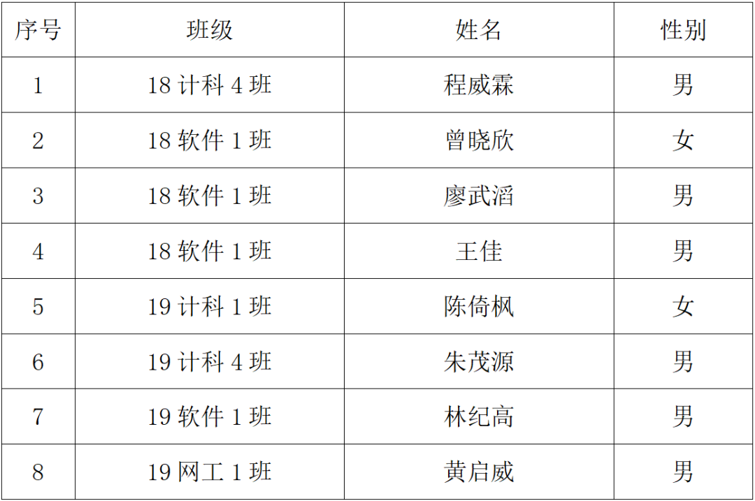 根据《关于“2021年广州理工学院大学生年度人物”评选活动的通知》文件精神,本着公平、公正、公开的原则,经本人申请、班级团支部推荐,院系评审,拟决定推荐计算机科学与工程学院18计科4班程威霖等8名同学代表学院参加评选。
