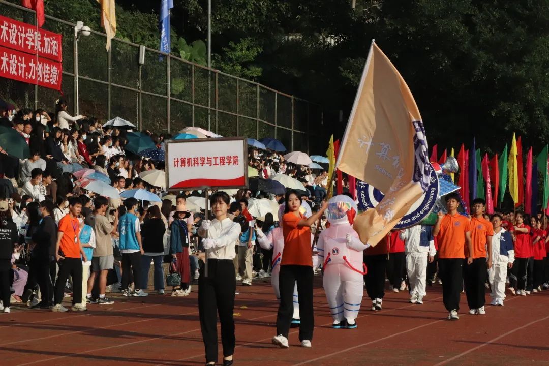 紧接着映入眼帘的是各院系组成的方队陆续登场。两个太空人带着整齐划一的计算机学院方阵,他们迈着坚定的步伐,带着坚毅的目光目视前方。