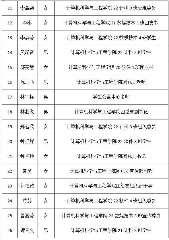 根据《中国共产主义青年团地方组织选举工作条例》有关规定和学校团委关于共青团广州理工学院第一次代表大会代表推荐选举工作有关要求,经学院团的全体委员会议研究,现将计算机科学与工程学院出席共青团广州理工学院第一次代表大会代表候选人初步人选公示如下(按姓氏笔画为序):