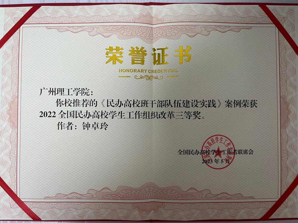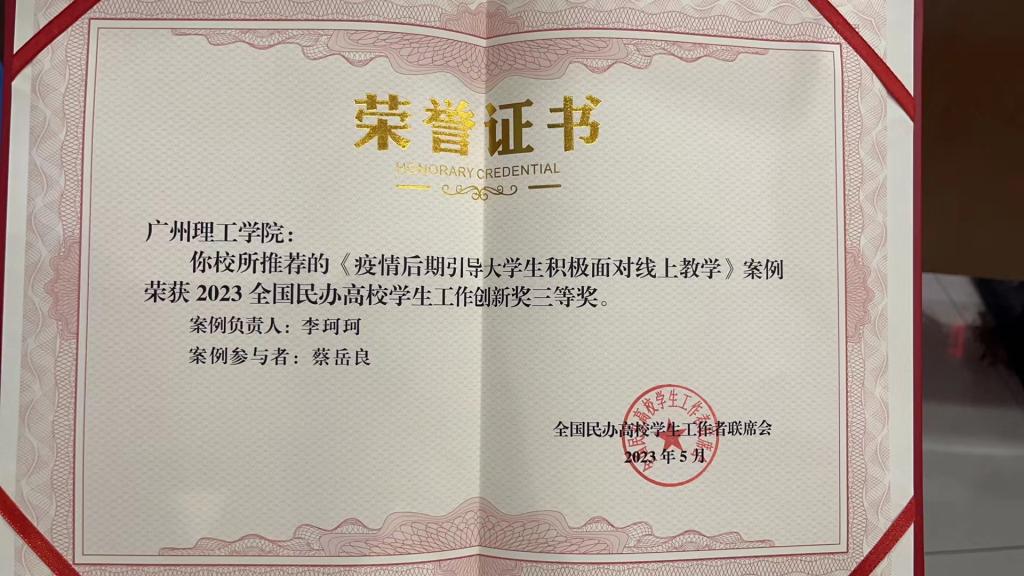 计算机学院两位辅导员的案例在本次评选活动中喜获佳绩。其中,钟卓玲老师的《民办高校班干部队伍建设实践》案例中荣获2022全国民办高校学生工作组织改革三等奖,李珂珂和蔡岳良联合撰写《疫情后期引导大学生积极面对线上教学》案例中荣获2023全国民办高校学生工作创新奖三等奖。