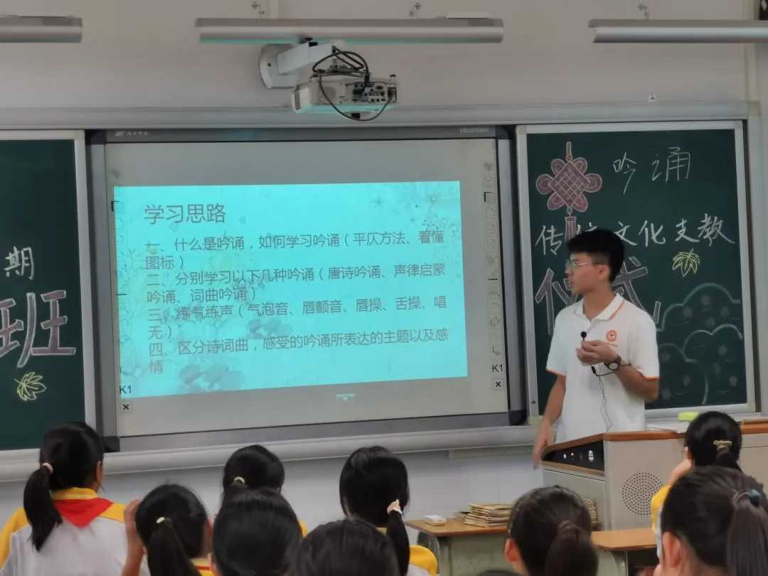 为了更好的开展支教活动,吴云锋同学提前到华南理工大学五山校区参加培训、去公益组织参与吟诵课训练、与队员们开线上会议讨论支教课程、准备支教上课用的课件与PPT等。充分准备后才到学校去,给学生开展教学活动。每天早上七点,就要起床参与值班活动;支教点没有食堂,就自己去赶集买菜做饭;有些留守儿童离支教点很远,便徒步三公里送离他们回家;利用晚上休息时间与支教点的值班老师交流学生的问题等。虽然每天都很辛苦,但吴云锋同学始终没有气馁,一直坚持将努力付诸在行动上,默默守候那些可爱的孩子们。作为支教团的吟诵课老师,吴云锋同学在吟诵诗文的同时,极力注入汉语言文化,将平仄及古诗词种类等语文知识融入其中,让孩子们的知识面得到拓展。同时,也很注重培养学生的参与能力。在讲解完知识点后,会请学生一起探讨或是回答问题,课堂氛围轻松活泼,到处充满着师生的欢声笑语。吟诵作为中国最传统的读书方式,极具民族意义,能够在这次支教中,将吟诵所学教授给学生们,吴同学感到非常荣幸。