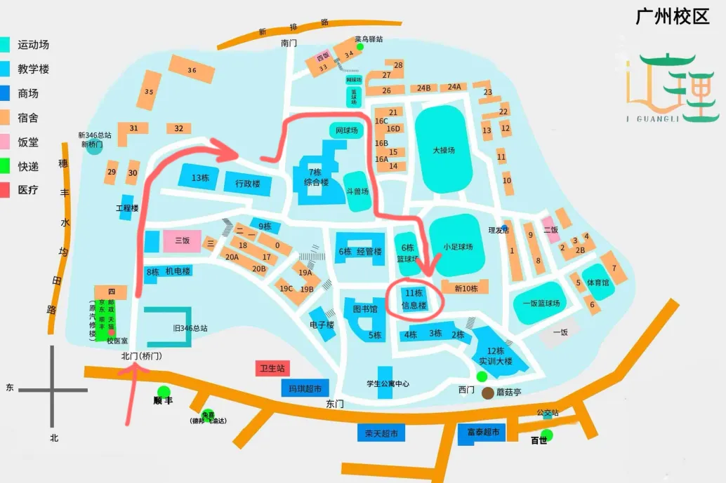 自驾车:(学校位于广河高速八斗站出口)导航到广州理工学院白云校区,从桥门进入抵达11栋