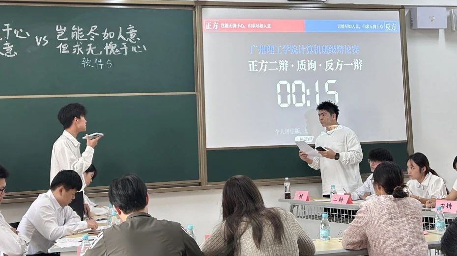决赛上,正方24软件4班与反方24软件5班的辩手们以饱满的热情和严谨的逻辑,就“岂能无愧于心但求尽如人意/岂能尽如人意但求无愧于心”这一辩题展开了激烈交锋。正方辩手们以其精心准备的论点和有力的论据,阐述了“无愧于心”的重要性。提出,只有当我们的行为和决策符合内心的道德标准时,才能在追求他人认可的过程中保持自我,不被外界的期望所左右。反方辩手们则以其独到的见解和深刻的分析,对“尽如人意”的命题进行了反驳。他们指出,在现实生活中,往往需要在不同的利益和期望之间做出平衡,而“尽如人意”往往是一种理想化的追求。