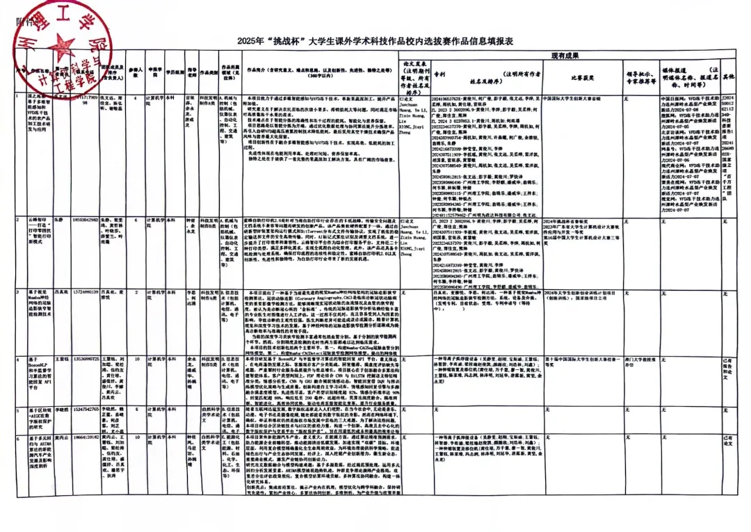 根据《关于举办2025年“挑战杯”大学生课外学术科技作品校内选拔赛的通知》相关要求,计算机学院积极组织学生参与,各班级踊跃上交申报作品。经过班赛推荐、学院评审初选等环节,最终从104份作品中选拔出以下15份作品推荐参加校赛。现将推荐参加校赛作品名单及相关信息进行公示。