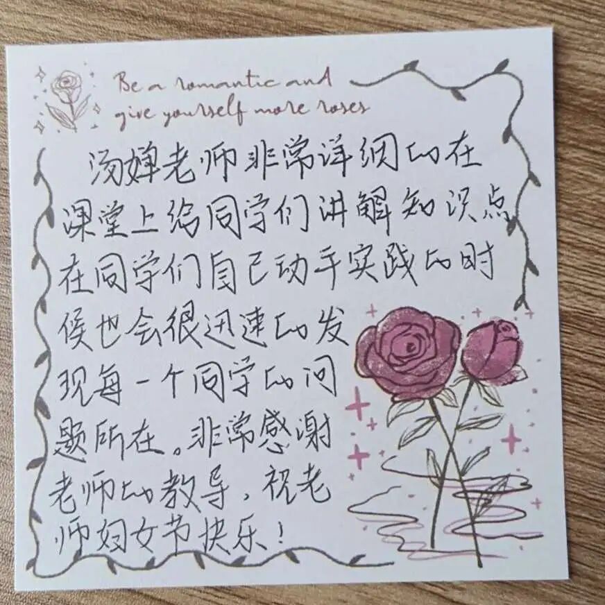同学们用最朴素真诚的方式,表达了最深厚的情感,让尊师重道的美德在笔墨间传承,在故事中流转。这不仅是一次节日的仪式,更是一次情感的共鸣。它让女教师们的付出被看见、被珍惜、被铭记;也让学生们明白,最好的教育,源于心灵与心灵的相互温暖。