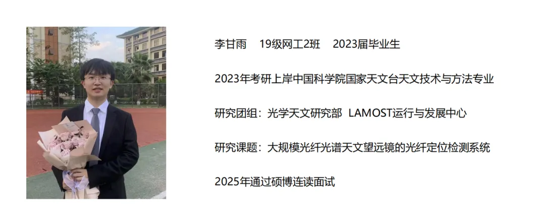 李甘雨同学作为计算机科学与工程学院网络工程专业的杰出代表,凭借优异成绩成功考取中国科学院天文台,目前正攻读硕博连读学位,主要聚焦于大规模光纤光谱天文望远镜的光纤定位系统视觉测量领域的研究。