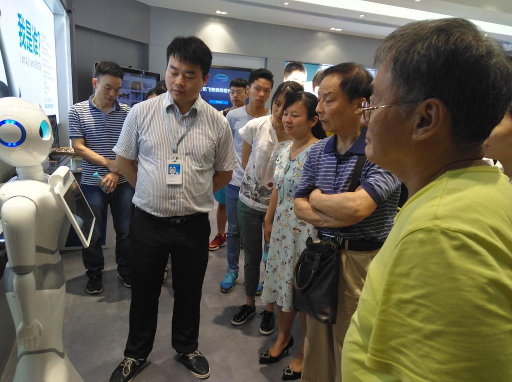 参观过程中,科大讯飞公司李经理重点介绍了人工智能技术展示厅,并给大家现场展示了智能语音系统、智能陪伴机器人、智能阅卷系统和智能导诊机器人等。其中,智能语音识别转写系统几乎可以同步将我们说出的普通话、方言或英语等多种语言等,马上转换成对应的中、英文,且准确率高达95%以上。特别是科大讯飞手机输入法,把语音转换成文字后,可以通过口令对内容进行修改,给不便输入文字的人提供了很大的便利。而针对孩子的陪伴机器人,则能根据说话者的问题结合语境跟人聊天互动。智能阅卷系统则有效应用于客观题和主观题的批改,特别是对于主观性很强的作文等都能根据评分标准准确而迅速的进行批改并且批注依据。