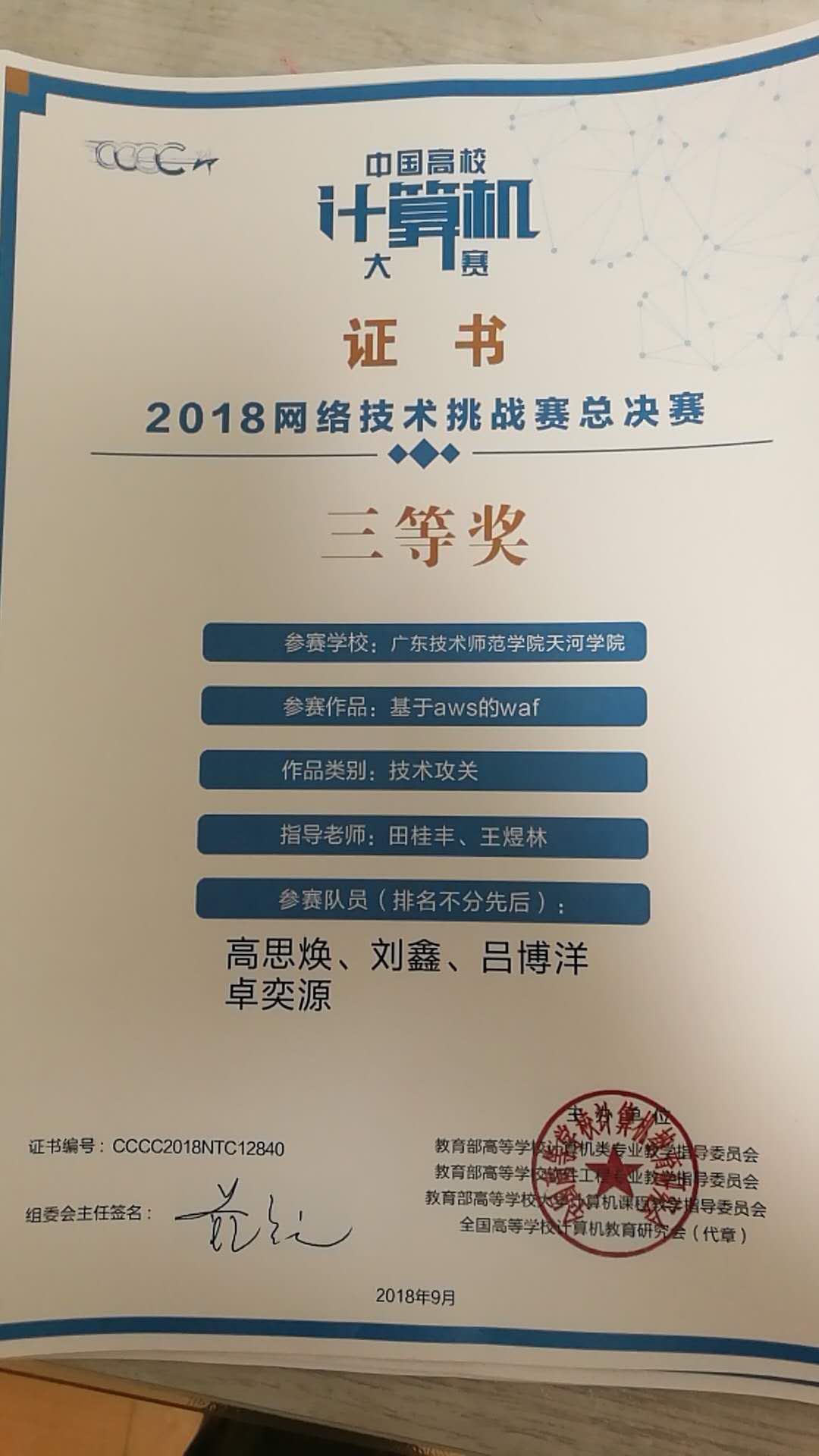 开云kaiyun体育官方网站网络工程系共组织了11支队伍共43人进入了区域选拔赛,从中选拔了3支队伍参加全国的决赛,其中申青连、王煜林老师指导的2015级网工班蔡欣洵、罗石铠、潘建兴同学组与易辉艳、王煜林老师指导的2015级网工班高思焕、郑锦良、陈宏展同学组,参加思科类的知识竞赛获得了华南区一等奖。田桂丰、王煜林老师指导的2015级网工班高思焕、吕博洋、刘鑫同学组参加亚马逊云计算安全类的知识竞赛获得了全国三等奖。在思科类的网络知识竞赛中,我校的成绩在华南区仅次于广东外语外贸大学,名列第二。