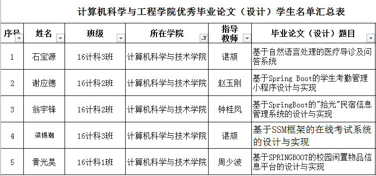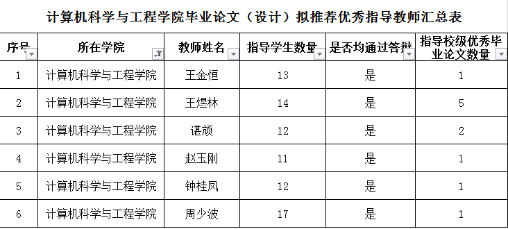 经学院毕业答辩工作小组评审,现对计算机科学与工程学院拟推荐的优秀毕业论文(设计)和拟推荐的优秀指导教师进行公示,公示期为2020.06.08-2020.06.10。