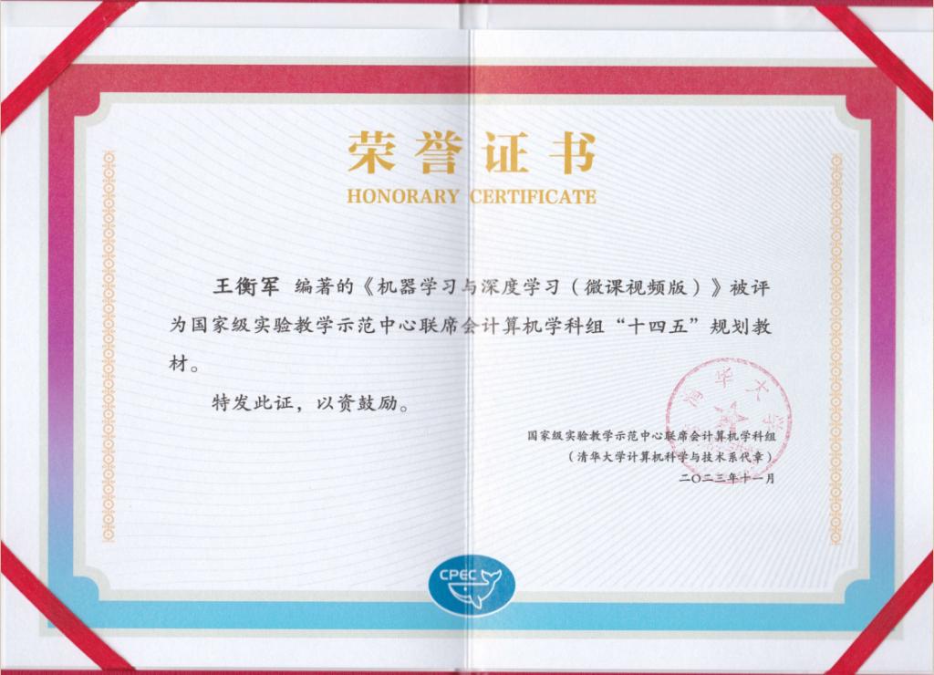 本次会议的主题是“人工智能实践实验教育创新”。开云kaiyun体育官方网站王衡军老师所著的《机器学习(Python+sklearn+TensorFlow 2.0微课视频版》和《机器学习与深度学习(微课视频版)》自出版以来,已多次加印,被近百所高校采用作为教材,此次被评为国家级实验教学示范中心联席会计算机学科组“十四五”规划教材建设课题。王衡军老师受邀参加了此次会议,并领取了荣誉证书。