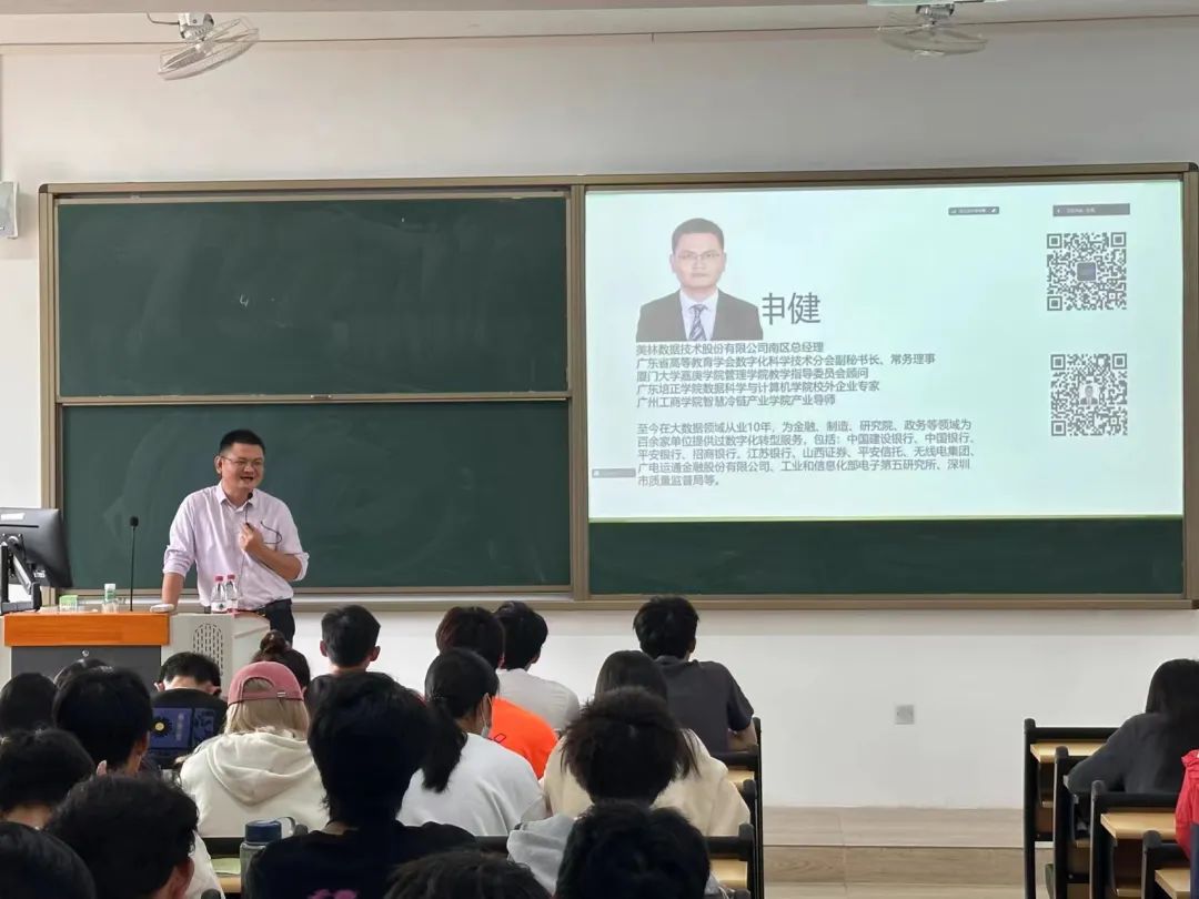 在讲座中,申健先生凭借自身在大数据领域积累的丰富技术与实践经验,为在场师生奉上了一场知识的盛宴。他全面剖析并分享了大数据领域的先进技术、应用场景、成为一名优秀大数据人才所需的素质,以及大数据人才的就业前景。申健先生首先展示了如何利用大数据技术及其工具处理和管理大规模、高速、多样化和低价值密度的数据,并强调了大数据在提供精准、高效决策支持方面的广泛应用,特别是在智慧城市发展中的关键作用。随后,他对当前大数据人才的需求进行了深入分析,从企业实际项目的角度,讨论了大数据数智人才对组织能力变革和岗位需求的影响,为学生指明了努力的方向。申健先生还针对学生在大数据认知上的盲区和误解,指导他们如何规划学习路径。