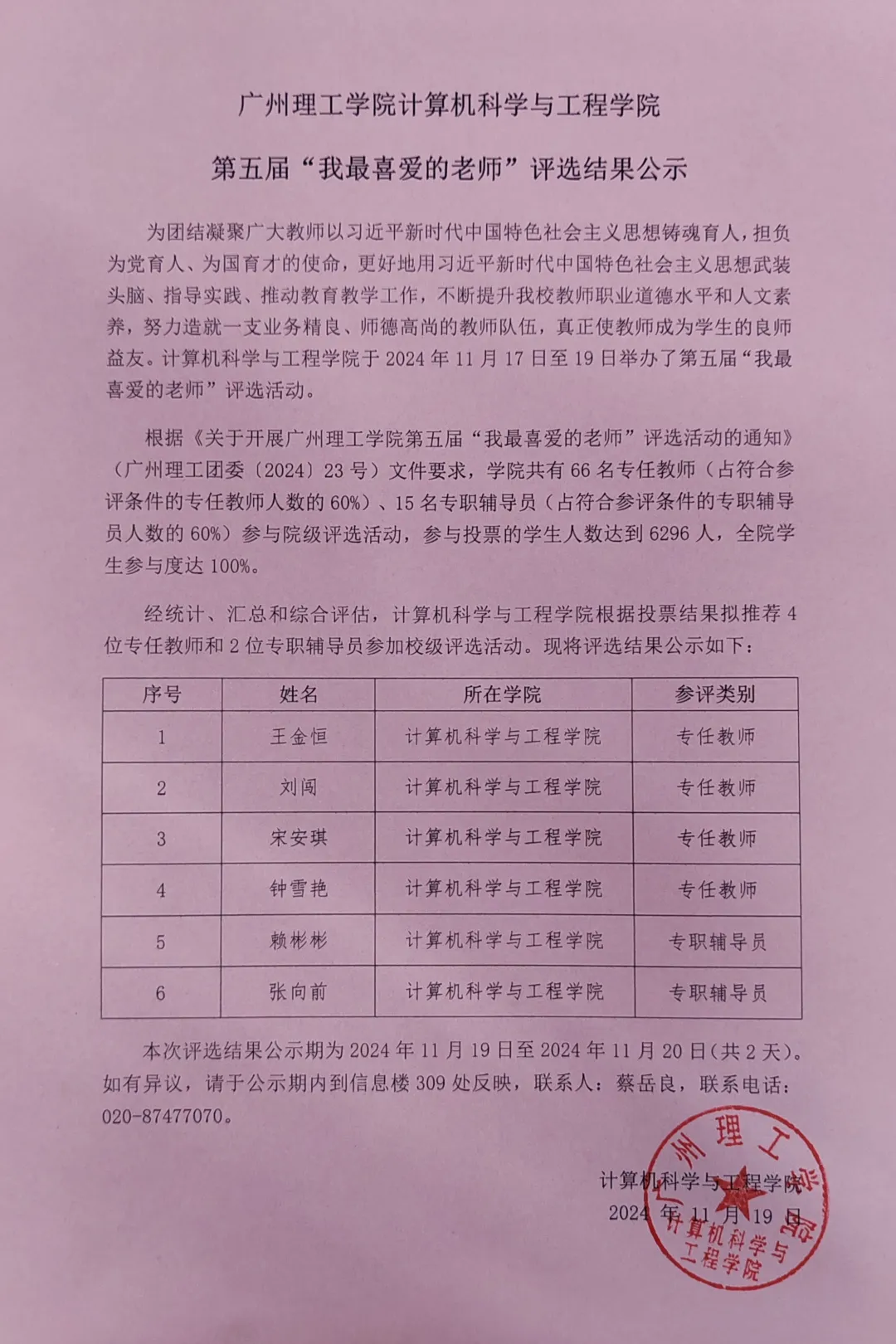 为团结凝聚广大教师以习近平新时代中国特色社会主义思想铸魂育人,担负为党育人、为国育才的使命,更好地用习近平新时代中国特色社会主义思想武装头脑、指导实践、推动教育教学工作,不断提升我校教师职业道德水平和人文素养,努力造就一支业务精良、师德高尚的教师队伍,真正使教师成为学生的良师益友。我校开展了广州理工学院第五届“我最喜爱的老师”评选活动,计算机科学与工程学院根据投票结果拟推荐4位专任教师和2位专职辅导员参加校级评选活动。