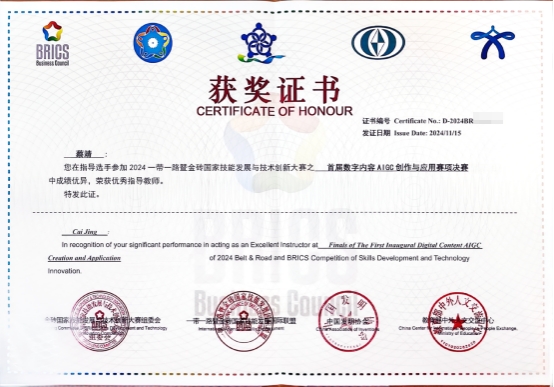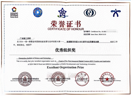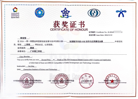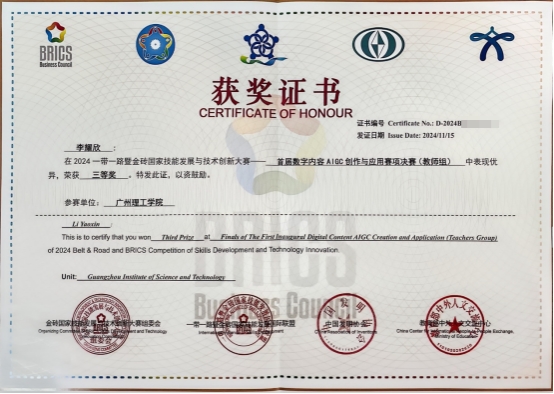 (李耀欣 蔡靖)近日,2024“一带一路”暨金砖国家技能发展与技术创新大赛首届数字内容AIGC创作与应用赛项总决赛圆满落幕,我校师生参赛团队表现出色,斩获(高职组和应用本科)多项殊荣,充分展现了学校在人工智能生成内容(AIGC)领域的实践与创新能力。其中,22数媒技术5班陈宝莹同学斩获了学生组全国二等奖,蔡靖老师荣获“优秀指导教师奖”,李耀欣老师荣获教师组全国三等奖,广州理工学院获得“优秀组织奖”。