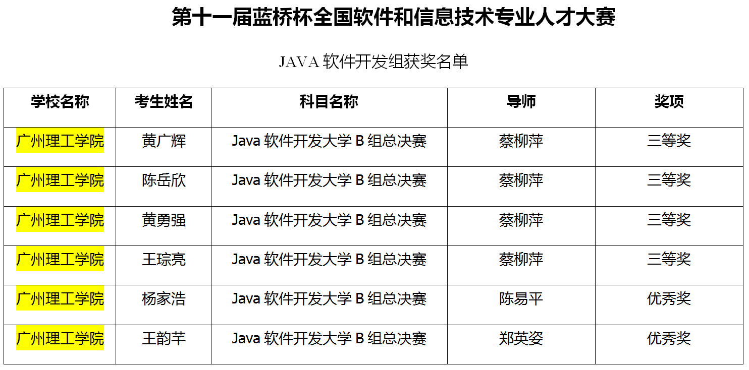 全国总决赛中,一等奖占5.4%,二等奖占15.92%,三等奖占20.67%,优秀奖不超过50%,获奖比例合计为70.05%。这次蓝桥杯国家总决赛,我校派出计算机科学与工程学院7名省赛一等奖选手,由专业老师郑英姿陪同,前往国赛赛点参加个人赛。最终,在Java软件开发组中获得国家三等奖的分别为陈岳欣、王琮亮、黄广辉、黄勇强4人,获国家优秀奖的为杨家浩和王韵芊2人。