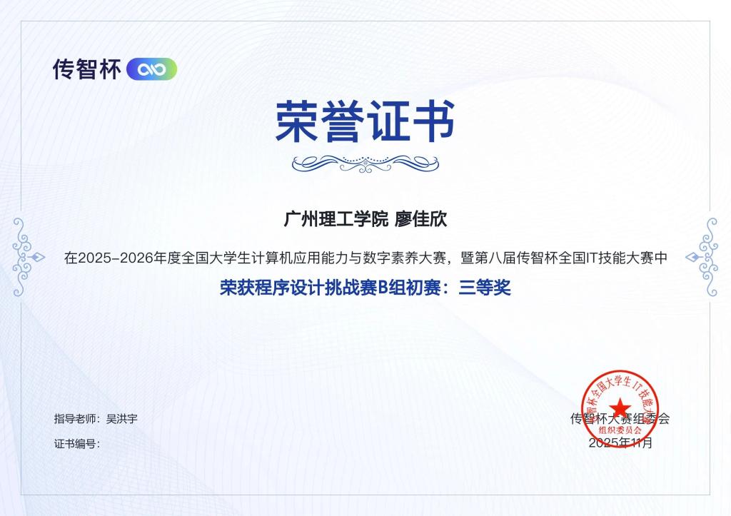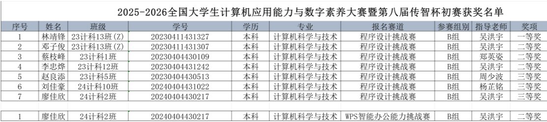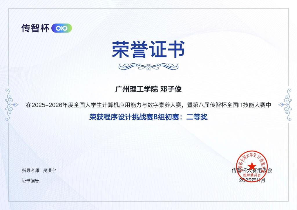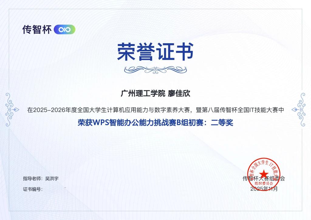 近日,2025–2026第八届“传智杯”全国IT技能大赛初赛成绩正式揭晓。该项赛事中,学院学子在《程序设计挑战赛》赛道上,荣获1个一等奖、3个二等奖和3个三等奖;在《WPS智能办公能力挑战赛》赛道中,斩获1个二等奖。与此同时,学院吴洪宇、郑英姿、周少波、杨芷铭4位教师被评为竞赛“优秀指导教师”。