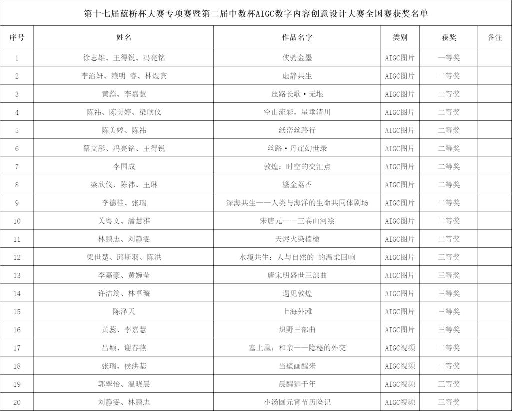 近日,从第十七届蓝桥杯大赛专项赛暨第二届“中数杯”AIGC数字内容创意设计大赛全国总决赛传来捷报。我校参赛团队凭借卓越的创意与扎实的技术能力,在竞争异常激烈的全国舞台上大放异彩,共荣获20项国家级大奖。其中,由徐志雄、王得锐、冯亮铭三位同学共同创作的作品《侠骋金墨》一举夺得全国一等奖。此外,我校还摘得二等奖11项、三等奖8项,获奖总数与质量在全国同类院校中位居前列,充分展现了我校在新兴交叉学科领域人才培养的丰硕成果。