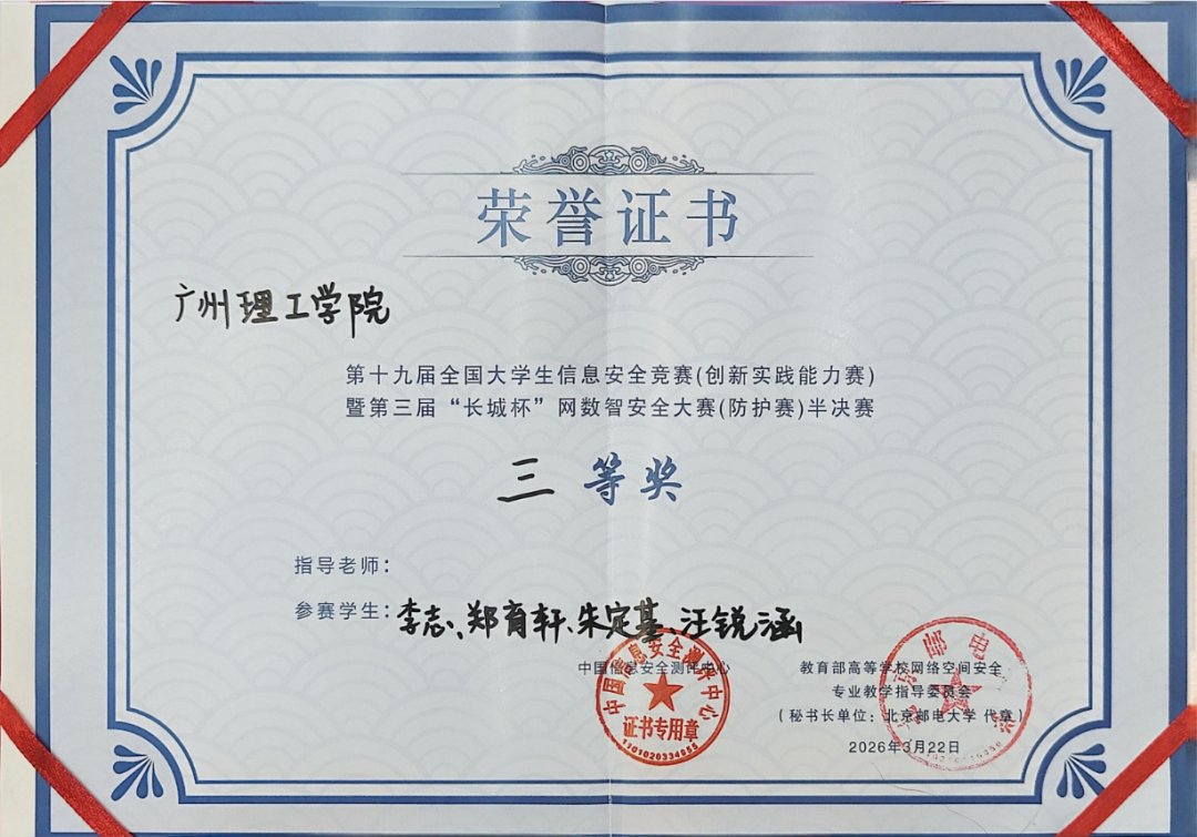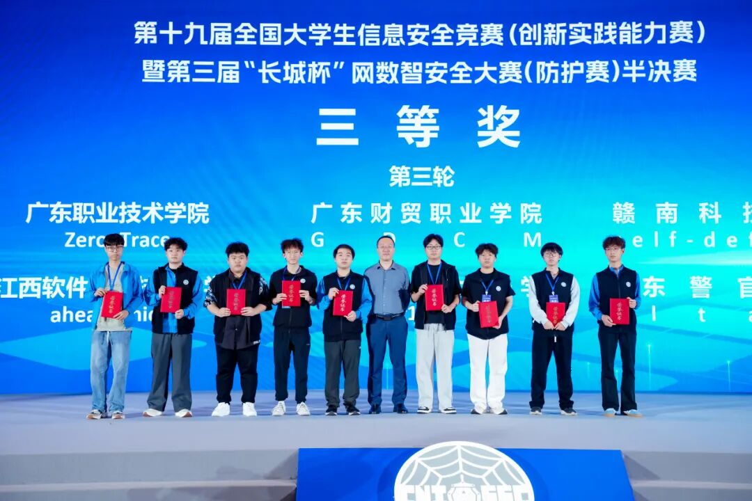 近日,第十九届全国大学生信息安全竞赛(创新实践能力赛)暨第三届“长城杯”网数智安全大赛(防护赛)半决赛在广东外语外贸大学圆满落幕。由学院23网工1班李志、郑育轩,25 网工 1 班汪锐涵和23 软件 6 班朱定基组成的JKLox3e战队凭借扎实的专业功底与出色的攻防实战能力,在来自全国的百余支高校队伍中脱颖而出,荣获大赛三等奖,充分展现了开云kaiyun体育官方网站在网络安全领域应用型人才培养的显著成果。