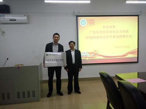 校企双方领导举行了签约、授牌。根据合作协议,在轩辕网络公司成立“广东技术师范学院天河学院校外实习就业基地”,在天河学院成立“轩辕网络IT人才培养基地”。通过校企深度合作,可望推动双方进一步开展多层次、多形式、多领域的合作,实现校企资源的有机结合和优化配置。