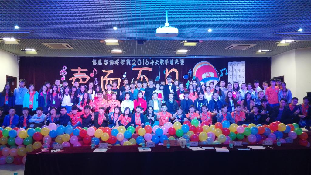 至此,信息与传媒学院十大歌手决赛圆满落幕。到场嘉宾、评委、选手及全体工作人员上台合影留念。