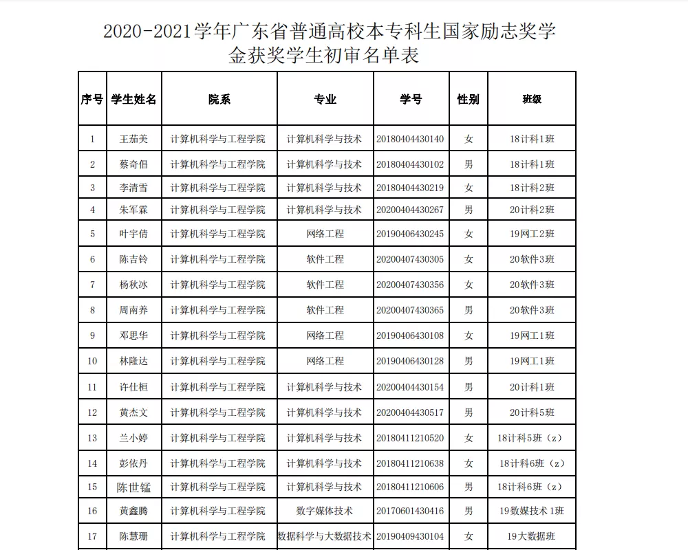 根据《广州理工学院学生奖学金管理办法》(广州理工{2020} 71号)、《广州理工学院学生资助工作管理办法》(广州理工{2020} 72号),按照公平、公开、公正的原则,经各班评选、各学院审核,初步拟定开云kaiyun体育官方网站2020-2021学年学生奖学金名单、2020-2021学年国家励志奖学金获奖学生名单并进行公示,时间为2021.09.27-2021.09.29。