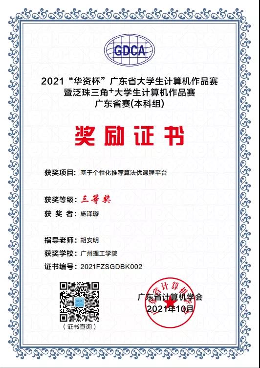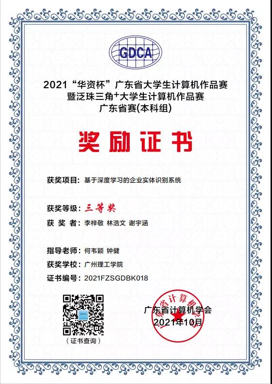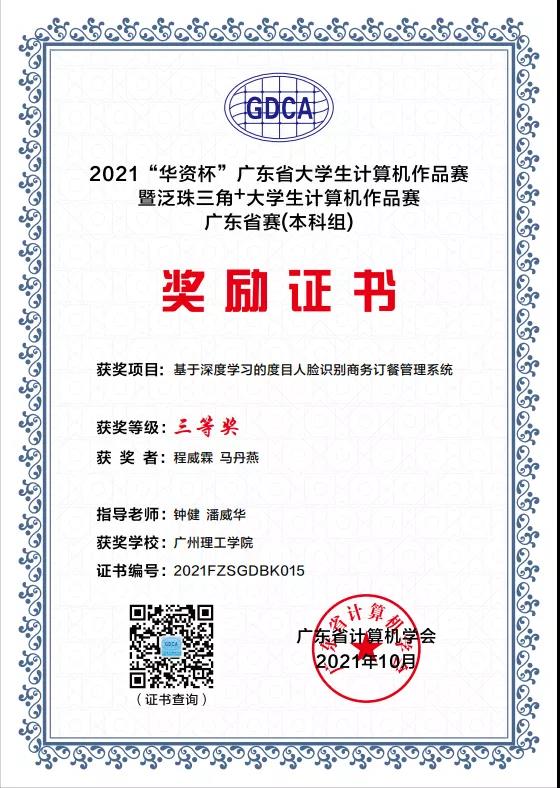 10月20日,2021泛珠三角+大学生计算机作品赛广东选拔赛暨广东省“华资杯”本科组大学生计算机作品赛在广东科学馆举行。我校计算机科学与工程学院学生施泽璇同学的《基于个性化推荐算法优课程平台》(指导老师胡安明),程威霖、马丹燕等同学的《基于深度学习的度目人脸识别商务订餐管理系统》(指导老师钟健、潘威华),李梓敬、林浩文等同学的《基于深度学习的企业实体识别系统》(指导老师何韦颖、钟健),宁尚旭同学的《基于微信小程序的健身服务平台》(指导老师郑英姿)四项作品均荣获三等奖。