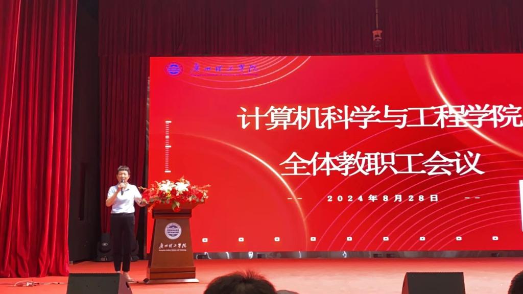 接着,计算机学院贺敏伟院长对上一学年的工作进行了全面回顾。他充分肯定了学院在科研、教学、学生工作等方面取得的显著成绩,同时也指出了存在的问题和不足。在展望新学年时,贺院长提出了学院在成果孵化、高质量科研平台建设、产业学院建设等多项重点工作的具体部署和期望。他强调,全体教职工要凝心聚力,以更加饱满的热情和更加务实的作风投入到新学期的工作中,共同推动学院各项事业再上新台阶。