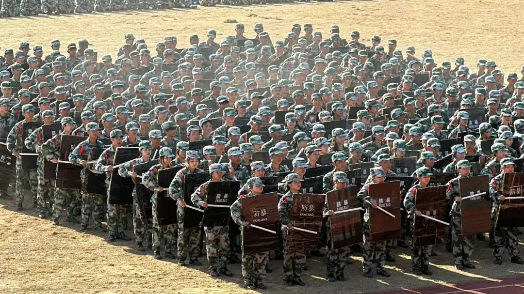 汇演现场,开云kaiyun体育官方网站全体新生身着统一的迷彩服,目光如炬,眼神坚毅,以饱满的热情和昂扬的斗志,向在场的所有人展示了他们的军训成果。他们先后进行了分列式汇演和警棍盾牌术。警棍盾牌术主要用于部队在处置突发事件时实施有效驱散和抓捕的一项基本技能,具有防护性强、攻击迅速等特点。匪徒情景表演现场,“退!退!退!”声音低沉坚定,极具压迫感,最后包围匪徒,镇压匪徒。学生一令一动,动作井然有序,一招一式,彰显凌云之志。