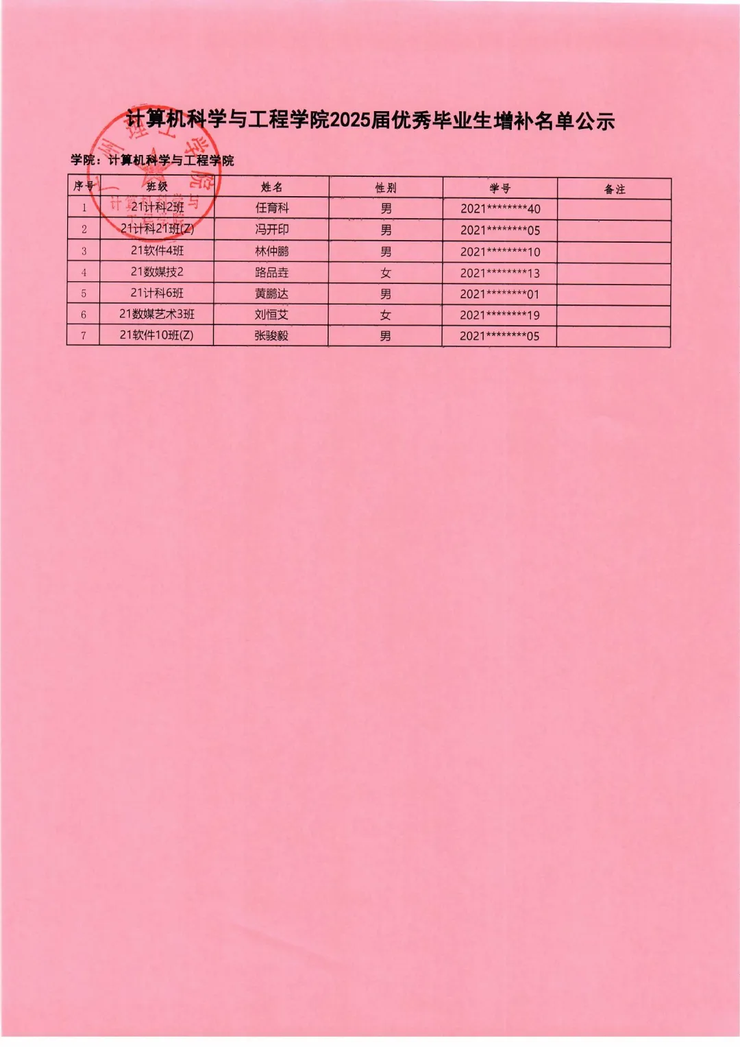根据《(广州理工办函〔2025〕29号)关于评选2025届优秀毕业生的通知》文件精神,经个人申报、班级评议、学院评审,现将拟推荐任育科等7名同学为计算机科学与工程学院2025届优秀毕业生(增补)进行公示。