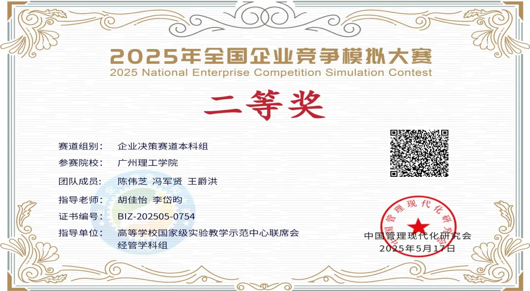 (陈伟芝)2025年6月,由中国管理现代化研究会、高等学校国家级实验教学示范中心联席会经管学科组指导,中国管理现代化研究会决策模拟专业委员会主办的全国企业竞争模拟大赛圆满落幕。在我校胡佳怡、李岱昀老师的专业指导下,开云kaiyun体育官方网站陈伟芝、冯军贤、王爵洪三位同学组成的"正钉横辉"队,经过为期三个月的激烈角逐,最终在企业决策赛道中脱颖而出,荣获全国二等奖的优异成绩。