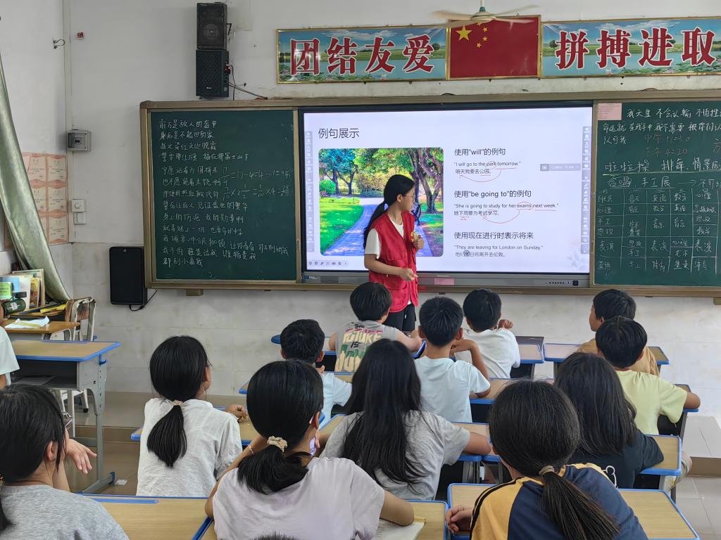 在三岭小学,队员林依婷在手工课上指导学生用扭扭棒制作立体花朵,培养学生的耐心和创造力。英语课堂上,队员陈梦妮为学生系统讲解了基础语法知识,并带领学生朗读例句和互动教学,让学生在轻松的氛围中掌握基础语法。队员陈静芸的心理辅导课则以“爱与尊重”为主题,采用“情境体验式”教学方法,引导学生深入探讨健康人际交往的核心准则,学生们在课堂上热烈讨论,收获颇丰。课间休息时,学生们仍保持高涨的学习热情,主动向队员请教问题,形成良好的师生互动。