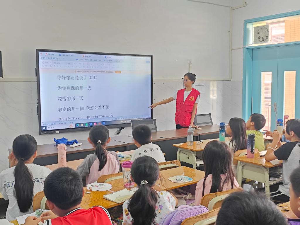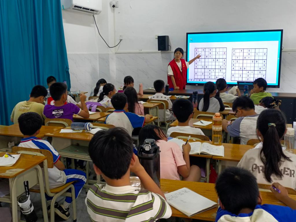 在洋口小学,队员孙嘉恒在朗诵课上带领学生赏析《沁园春·雪》,通过抑扬顿挫的诵读,让学生感受诗词的豪迈气概。音乐课上,队员林庭庭选取流行歌曲《晴天》和励志曲目《最好的安排》,以分句教唱、合唱排练的方式提升学生的音乐感知力。手工课和数学课则分别由队员罗晖负责,扭扭棒创意制作锻炼了学生的动手能力,数独游戏激发了他们的逻辑推理兴趣,课堂氛围活跃,学生参与度极高。
