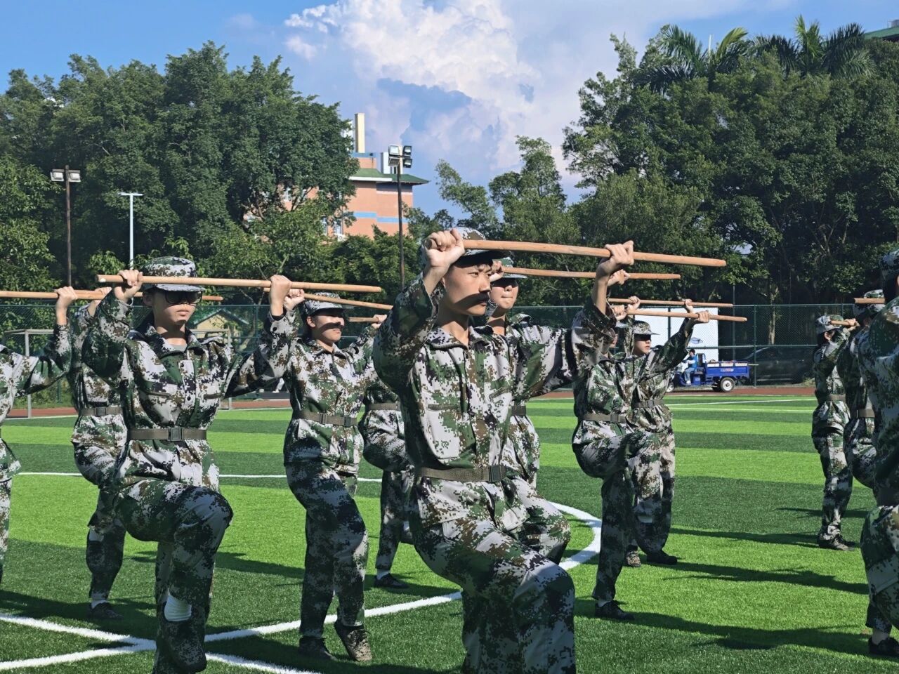 刺杀方阵则突显凌厉气势。新生们手握训练枪,一声令下,突刺、防刺、击打,动作刚猛有力、杀声震天。突刺时如利箭离弦,收枪时迅捷稳健,眼神锐利,吼声激越,仿佛每一招都凝聚着必胜的信念,以实战姿态诠释着“敢打必胜、勇当先锋”的钢铁意志。