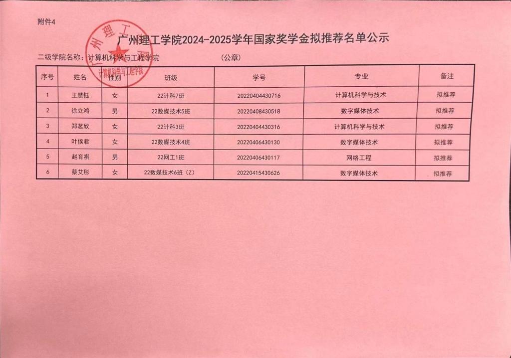 根据《广州理工学院学生处关于印发《2024-2025学年奖学金评比工作方案》的通知》广州理工学函[2025]162号,本着公平、公开、公正的原则,经学院国家奖学金评选工作领导小组比照评选条件开展评议,现将评比结果予以公示,公示期为2025年9月25日至9月28日。如对公示有异议,请在公示期内向辅导员老师反馈,或以书面形式并署真实姓名投信到信息楼309办公室旁信箱或电子信箱jsjxy@gzist.edu.cn反馈,也可致电计算机学院办公室:020-87477070。
